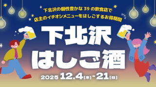お酒のイベント街バルイベント「下北沢はしご酒」12月4日~21日まで。チャージ・お通しなしで39店舗を気軽に飲み歩き 2025年12月4日(木)~12月21日(日)東京・世田谷区の下北沢駅周辺で食べ呑み歩きイベント「下北沢はしご酒」開催。参加する飲食店39店舗が期間限定のオリジナルメニューを取り揃えます。 2025.11.20お酒のイベント