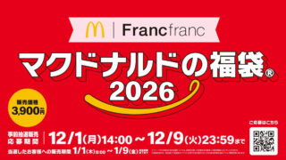 食のイベントFrancfrancコラボの「マクドナルドの福袋2026」公式アプリで事前抽選販売。予約受付は12月1日~9日 2025年12月1日(月)~12月9日(火)マクドナルドは「マクドナルドの福袋2026」の公式アプリ事前抽選販売の受付を開始。3,910円相当の商品無料券とフランフランとコラボしたグッズが詰まったおトクな福袋。 2025.11.25食のイベント