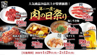食のイベント牛角「肉の日祭り」1月29日~2月12日開催。カルビやハラミ、ビールなど20品以上が特別価格 2026年1月29日(木)~2月12日(木)牛角で「年に一度の肉の日祭り」開催。定番メニューを中心に20品以上が何皿・何杯でも特別価格で提供されます。 2026.01.27食のイベント