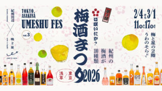 お酒のイベント浅草・梅と星で「紀州の梅酒まつり」2月4日~3月1日開催。本場・紀州の梅酒100種類を飲み比べ 2026年2月4日(水)~3月1日(日)東京・浅草の「梅と星」にて「紀州の梅酒まつり2026」開催。本場・紀州の梅酒100種類の飲み比べが楽しめます。 2026.01.27お酒のイベント