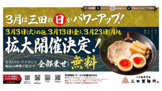 食のイベント三田製麺所、通常410円の「全部のせトッピング」が無料に。3月は3日・13日・23日の3回開催 三田製麺所の人気企画「三田の日」が2026年3月は3日・13日・23日の3回開催。クーポン提示で味玉やチャーシューなどの全部乗せトッピングが無料に。濃厚つけ麺を特製仕様で楽しめる見逃せないチャンスです。 2026.02.27食のイベント