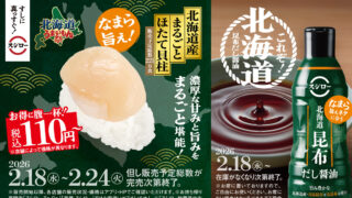 食のイベントスシロー「北海道うまいもん祭」開催。ほたて・いくら・ラーメン・スイーツまで北海道グルメが大集合 2026年2月18日(水)~2月24日(火)スシローで「北海道うまいもん祭」開催。北海道産ほたて貝柱やいくら、数の子、名店監修のらーめん、白いミルクレープまで登場。北海道の旨いものを一度に楽しめる期間限定フェア。 2026.02.17食のイベント