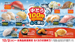 食のイベントはま寿司「中とろ100円とふぐ祭り」12月2日から開催。“中とろ・真いか・豚たん”などが110円 2025年12月2日(火)から、はま寿司で「中とろ100円とふぐ祭り」開催。まぐろ中とろ・大葉真いか握り・炙り豚たんが110円。そのほか国産の真フグや旬の海鮮、冬にぴったりのメニューが勢ぞろいする期間限定のキャンペーン。 2025.12.01食のイベント