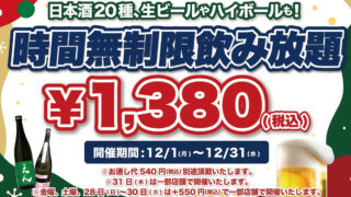 お酒のイベント日本酒原価酒蔵、時間無制限(最大11時間)飲み放題が日曜~木曜1,380円。紀土など20種+生ビールも 2025年12月1日(月)~12月31日(水)日本酒原価酒蔵の全店舗(18店舗)で「日本酒時間無制限飲み放題」のキャンペーンを開催。期間中の日曜日~木曜日は1,380円で最大11時間飲み放題が楽しめます。 2025.12.01お酒のイベント