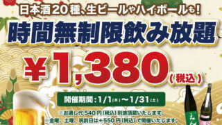 お酒のイベント日本酒原価酒蔵、時間無制限(最大11時間)飲み放題が日曜~木曜1,380円。紀土など20種+生ビールも 2026年1月1日(木)~1月31日(土)日本酒原価酒蔵の全店舗(18店舗)で「日本酒時間無制限飲み放題」のキャンペーンを開催。期間中の日曜日~木曜日は1,380円で最大11時間飲み放題が楽しめます。 2025.12.28お酒のイベント