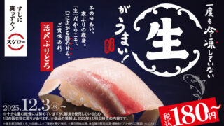 食のイベントスシロー「冬のうまいもん祭」12月3日から開催。“ぶりとろ・びんとろ”など冬の味覚が勢揃い 2025年12月3日(水)からスシローに「冬のうまいもん祭」開催。“活〆ぶりとろ・びんとろ”など冬の味覚が勢ぞろい。 2025.12.01食のイベント