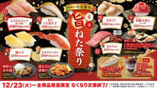 食のイベント年末年始はごちそう寿司!はま寿司「豪華旨ねた祭り」12月23日から開催 2025年12月23日(火)から、はま寿司で「年末年始豪華旨ねた祭り」開催。とろびんちょうが110円、本鮪中落ち・ハマグリ176円。そのほか年末年始にぴったりな、豪華食材を使った寿司ネタや限定メニューが勢ぞろいする期間限定のキャンペーン。 2025.12.22食のイベント