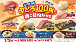 食のイベントはま寿司「中とろ100円と春の旨ねた祭り」開催。中とろ・たいら貝・ししゃもフライが税込110円で登場 2026年3月3日(火)から、はま寿司で「中とろ100円と春の旨ねた祭り」開催。厳選まぐろ中とろをはじめ、たいら貝やししゃもフライ握りが税込110円で登場。天然ぶりや車えび、鹿児島黒牛握りなどの贅沢ネタ、ラーメンやデザートも楽しめる春の特別フェア。 2026.03.02食のイベント