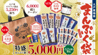 ショッピング大戸屋「まんぷく袋」を12月26日から発売。最大6,250円もおトクな福袋。11月4日からネット予約開始 2025年12月26日(金)~2026年1月14日(水)大戸屋で福袋「まんぷく袋」発売。大戸屋オリジナル商品と、大戸屋全店で使える冊子クーポン「まんぷくーぽん」が入った福袋。最大6,250円もおトク。11月4日(火)からネット予約受付開始。 2025.10.28ショッピング
