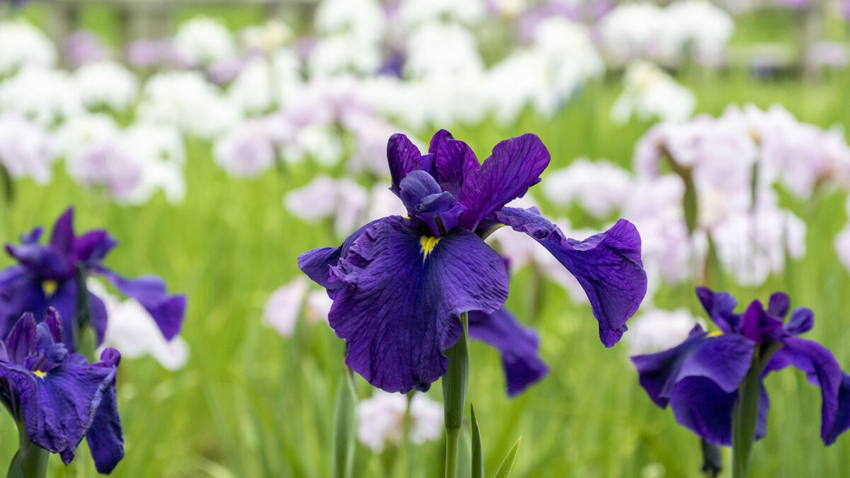 花菖蒲田には約50品種・1,500株のハナショウブが植えられていて、バラとはまた異なる、しっとりとした初夏の風景を楽しめます。