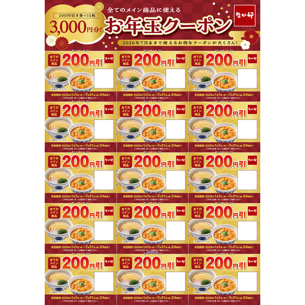 お年玉クーポンは、200円引き券×15枚の総額3,000円分。