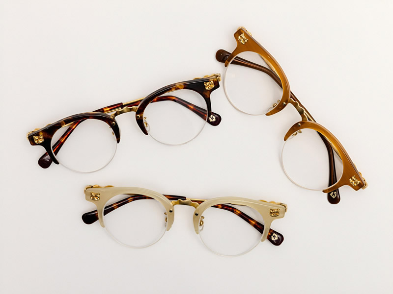 フレームに猫のモチーフをあしらった個性的なアイウェア。