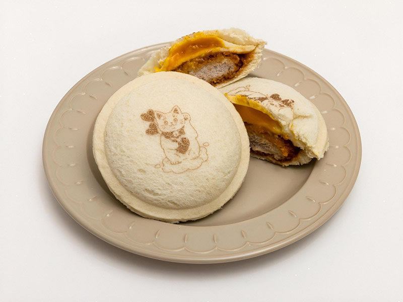 招き猫の焼き印を施したポケットサンド。やわらかなヒレカツとたまごの組み合わせが定番人気。