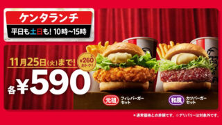 食のイベントケンタッキーのバーガーセット2種が260円もおトク。10月29日~11月25日のランチタイム限定 2025年10月29日(水)~11月25日(火)ケンタッキーフライドチキンの『ケンタランチ』で提供している「チキンフィレバーガーセット」と「和風チキンカツバーガーセット」が通常より260円もおトクな590円で販売されます。平日・土日とも10時~15時限定。 2025.10.24食のイベント