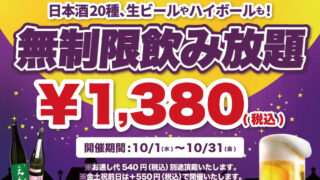 お酒のイベント日本酒原価酒蔵、時間無制限(最大11時間)飲み放題が日曜~木曜1,380円。紀土など20種+生ビールも 2025年10月1日(水)~10月31日(金)日本酒原価酒蔵の全店舗(18店舗)で「日本酒時間無制限飲み放題」のキャンペーンを開催。期間中の日曜日~木曜日は1,380円で最大11時間飲み放題が楽しめます。 2025.09.29お酒のイベント