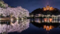 光に照らされた桜と社殿が浮かび上がり、幻想的で厳かな雰囲気を楽しめます。